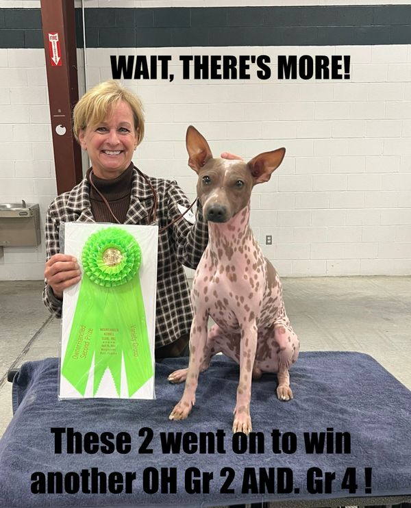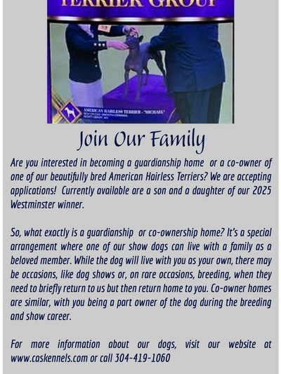 We are proud to have bred multiple AKC Grand Champion American Hairless Terriers, including 2025 Best of Breed winner, Select Dog and Award of Merit at the largest Westminster American Hairless Terrier entry in history. With our minimal breeding program, we have produced Grand Champion and group placing Chihuahuas, and more importantly, well-adjusted family pets. Our puppies are not raised in a kennel environment but in our home.